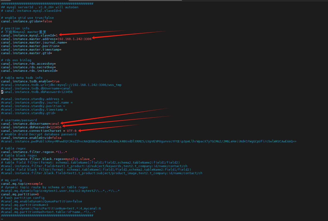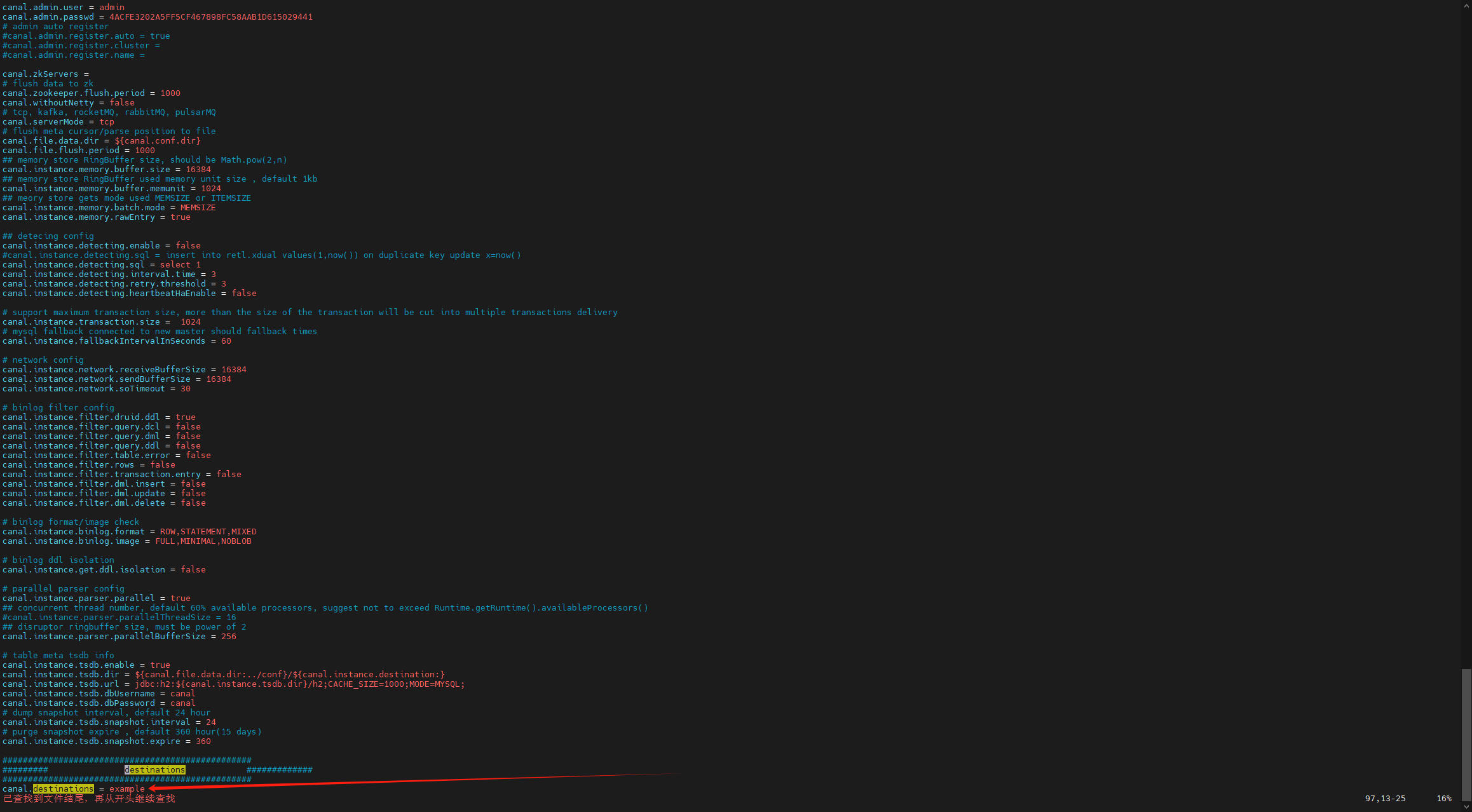 注意:canal.destination配置要与后面springboot中的配置保持一致