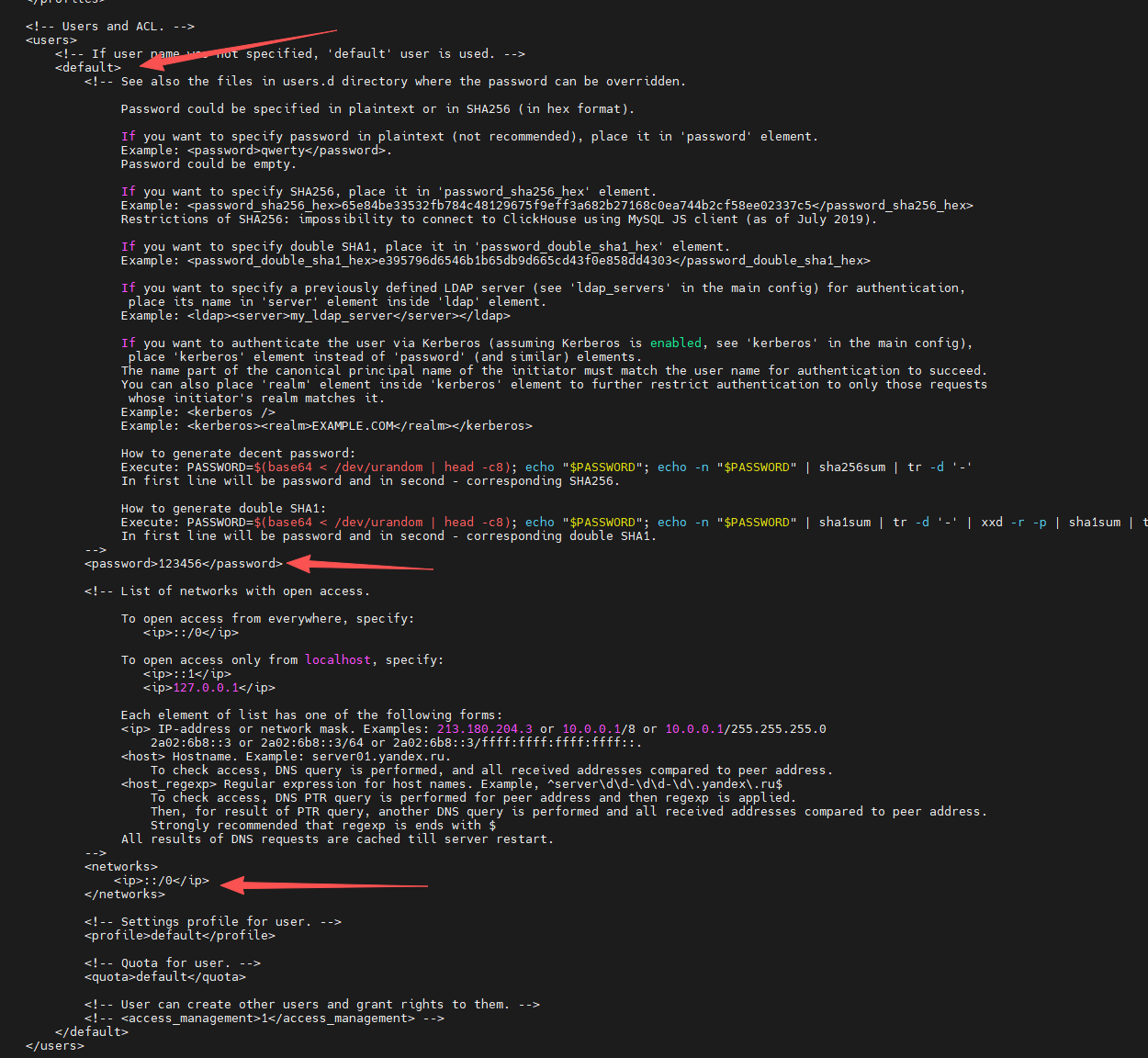 <listen_host>0.0.0.0</listen_host>2、修改users.xml,配置密码