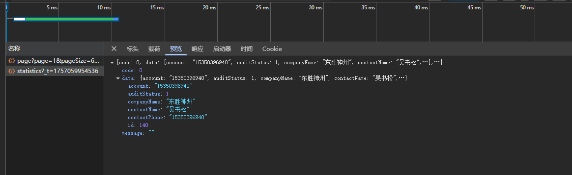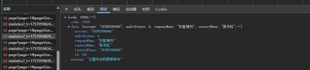 响应数据:{"code":10002,"data":{"account":"15350396940","auditStatus":0,"companyName":"东胜神州","contactName":"吴书松","contactPhone":"15350396940","id":140},"message":"云管平台权限审核中"}
