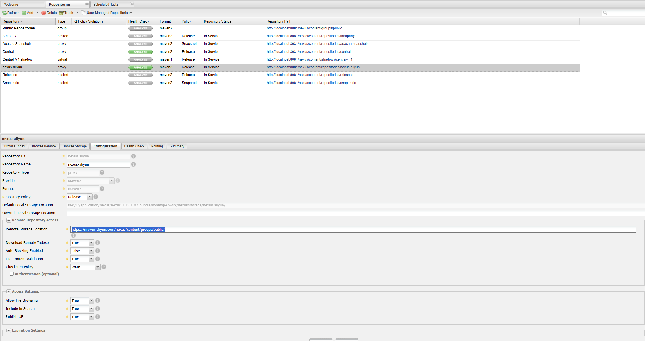 2、一般是国内的仓库,速度快,可以通过定时任务批量拉取jar,到hosted仓库。如:https://maven.aliyun.com/repository/central/