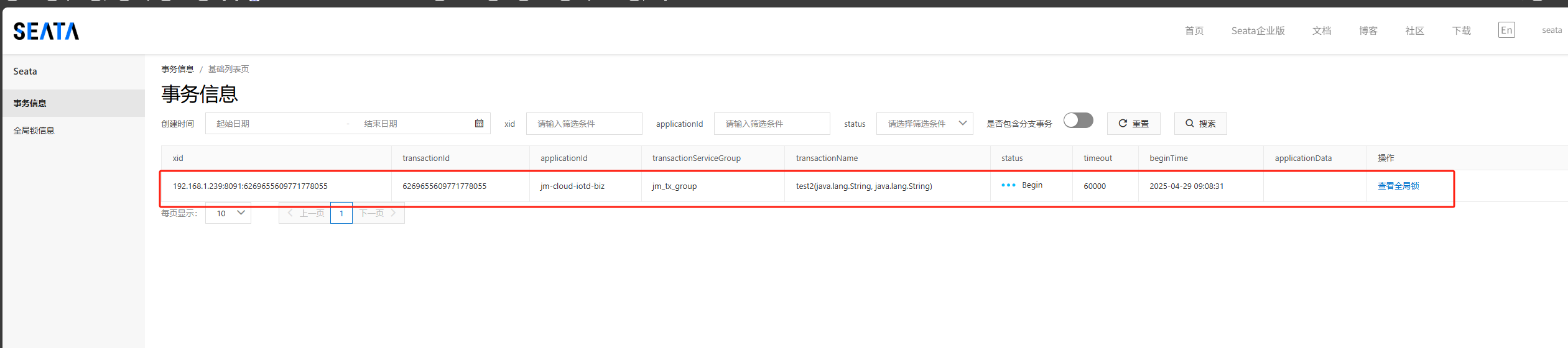 打断点,看下seata后台数据情况