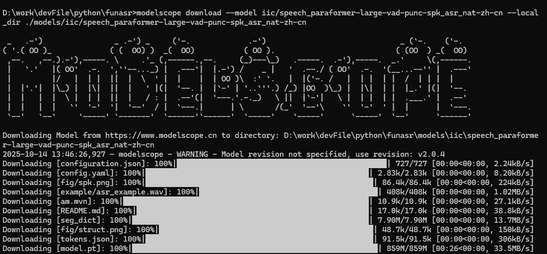 modelscope download --model iic/speech_campplus_sv_zh-cn_16k-common --local_dir ./models/iic/speech_campplus_sv_zh-cn_16k-common1、iic/speech_paraformer-large-vad-punc-spk_asr_nat-zh-cn:语音转文字模型